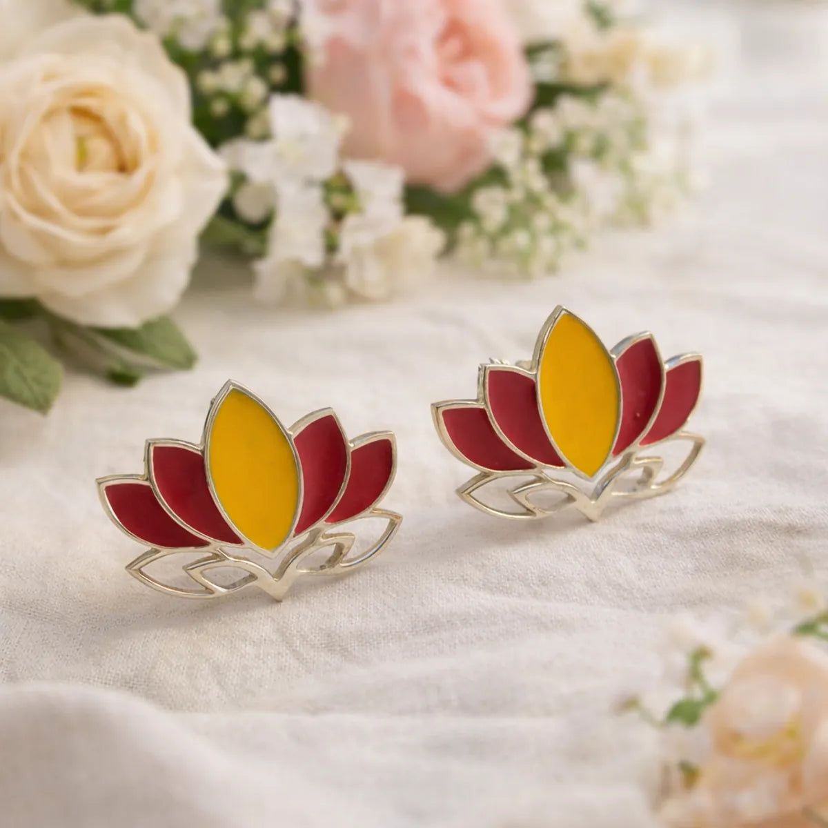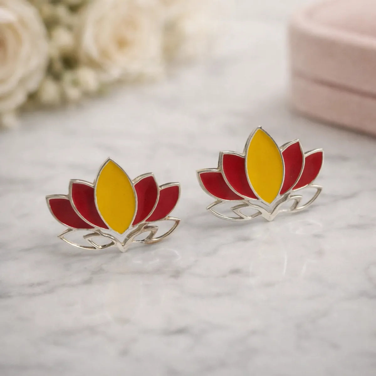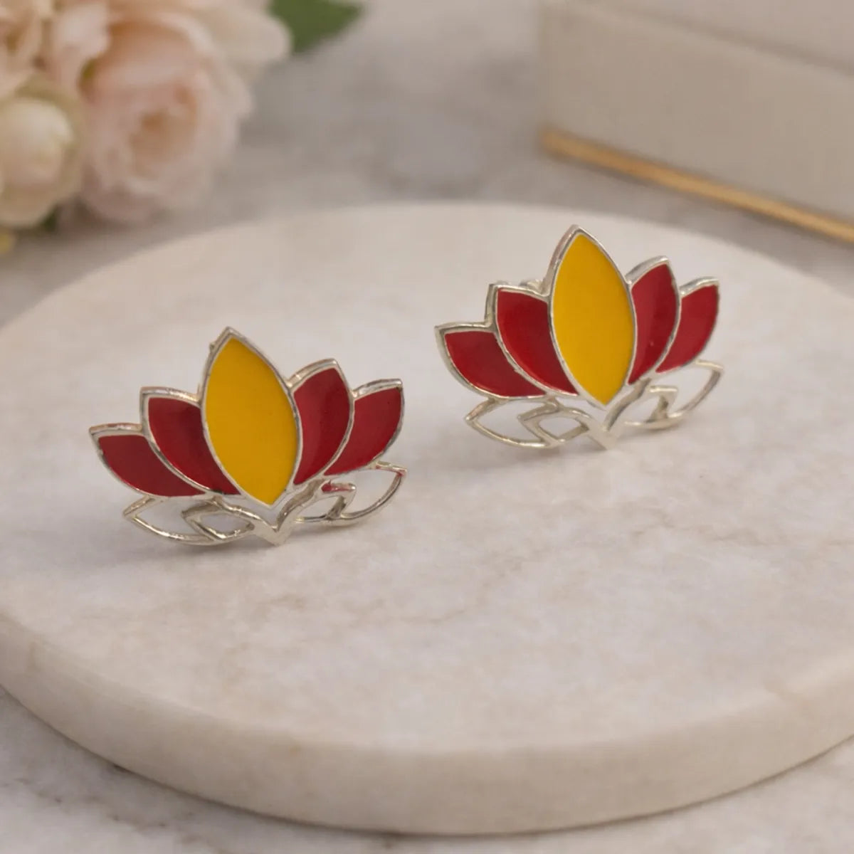 Lotus Flower Meenakari Enamel Silver Stud Earrings Traditional Folk Art