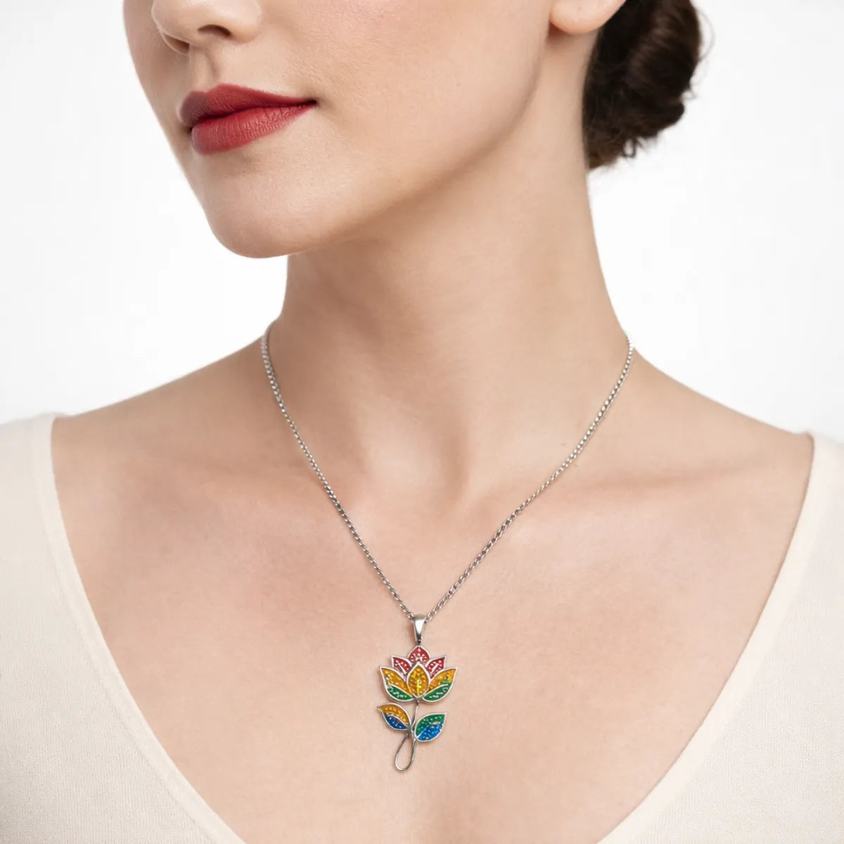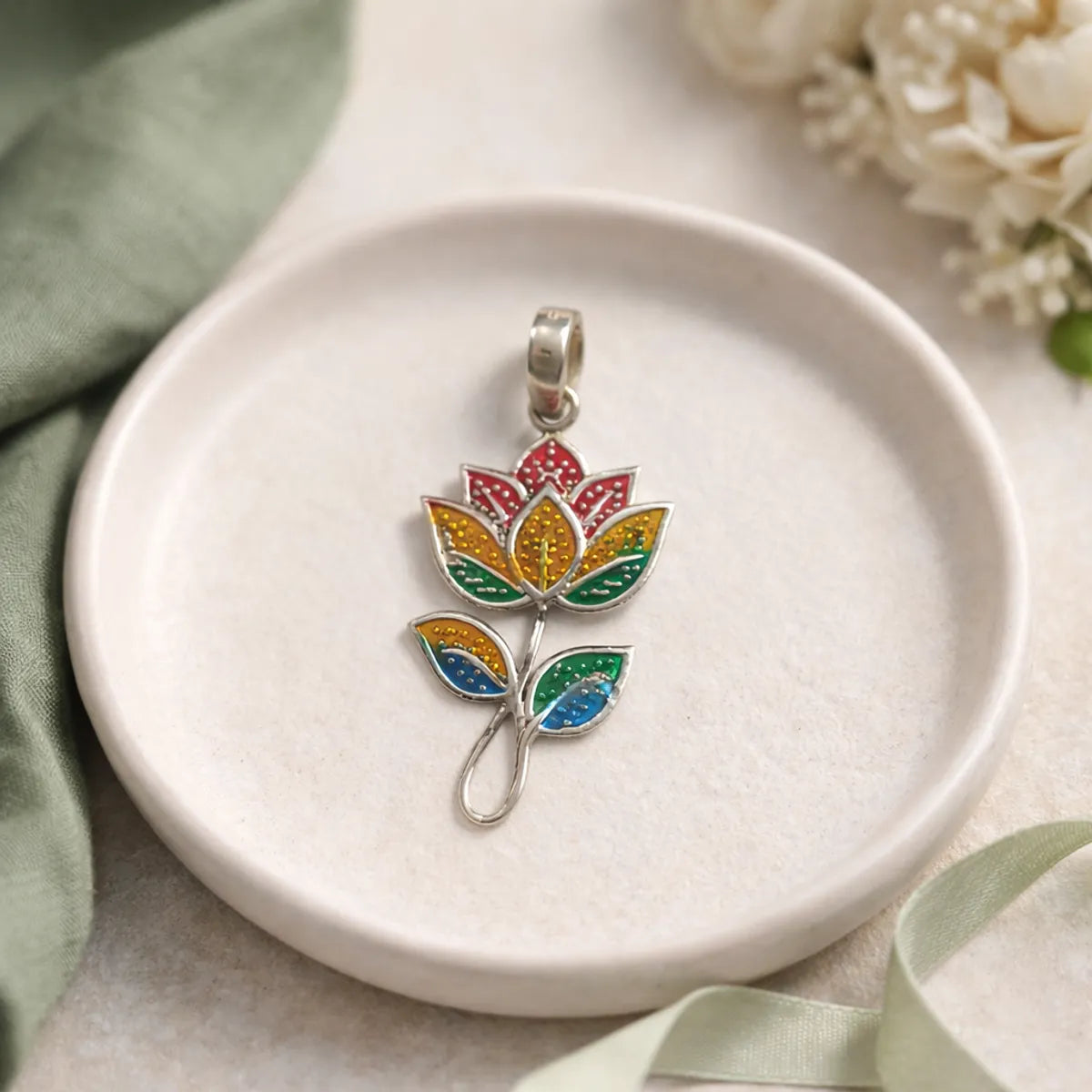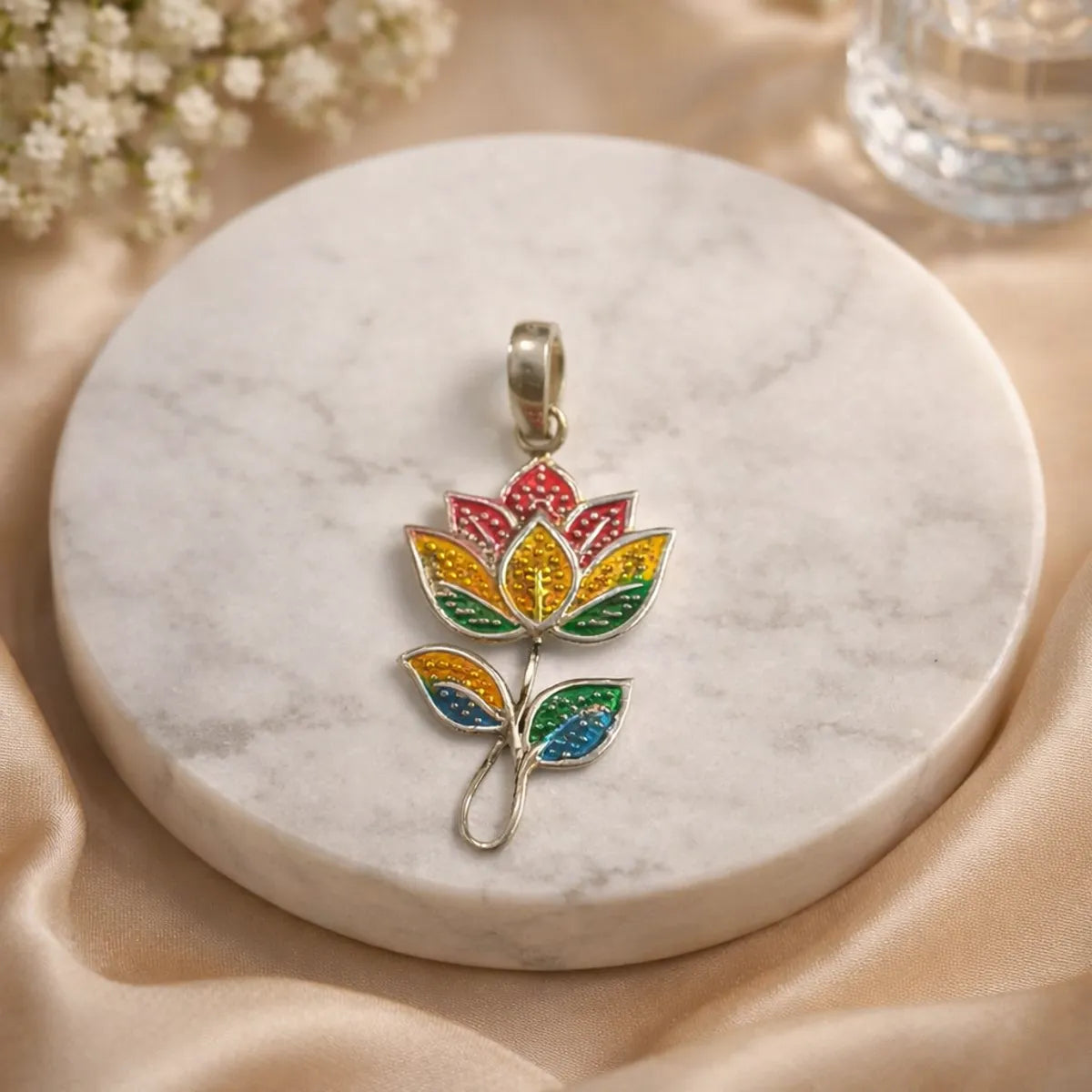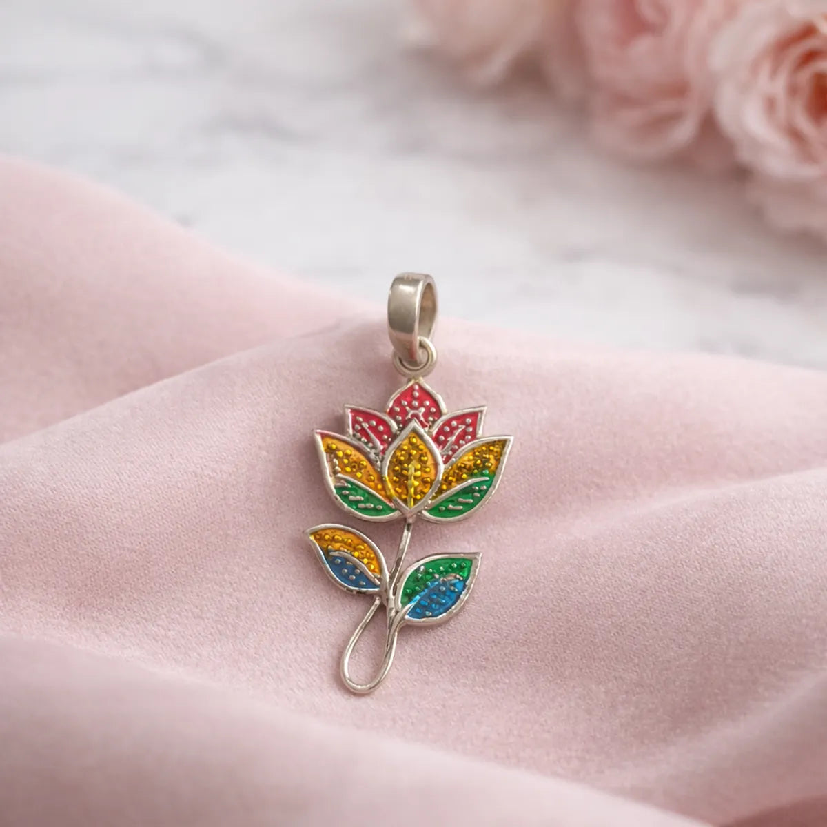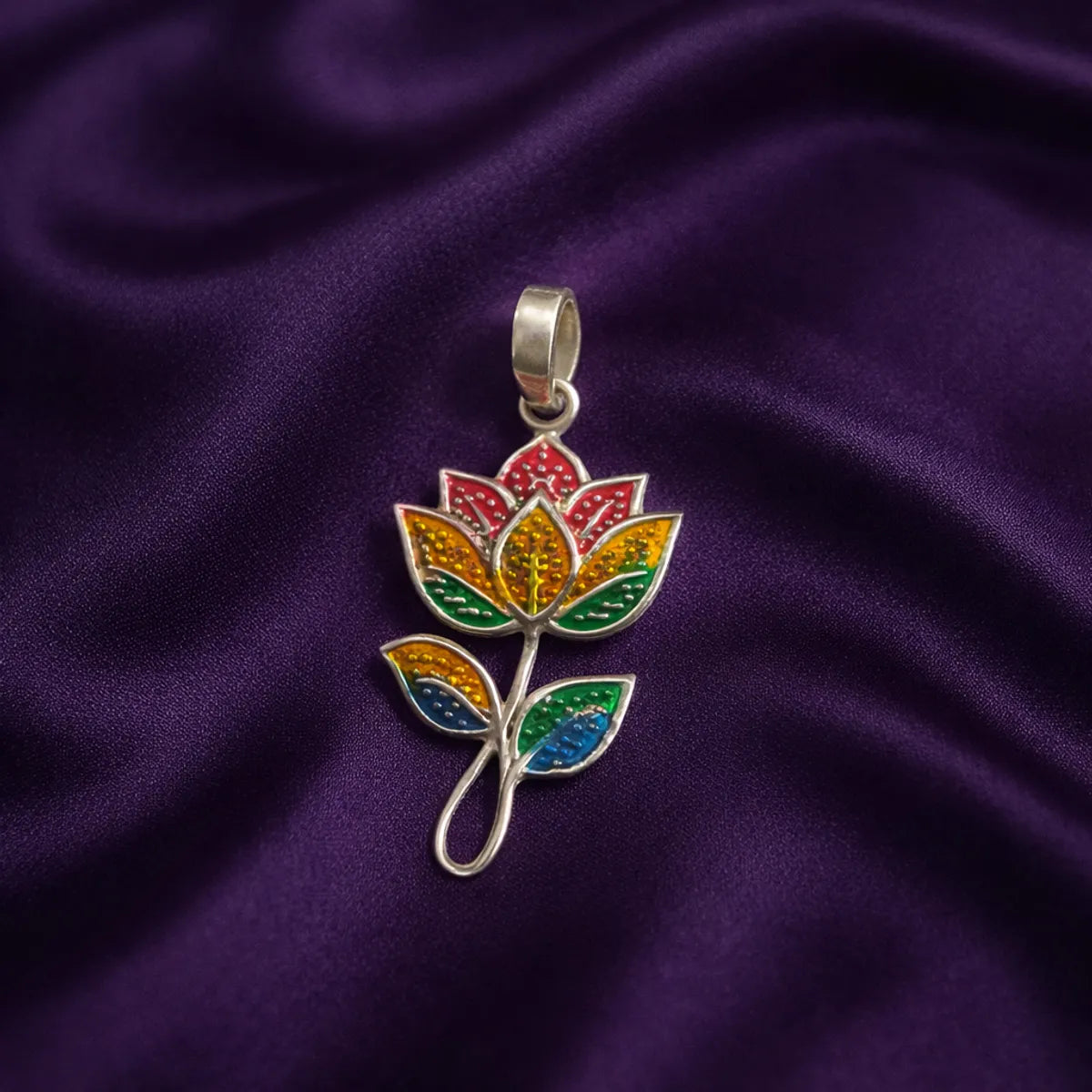 Silver Meenakari Flower Pendant Traditional Folk Art Enamel Jewelry