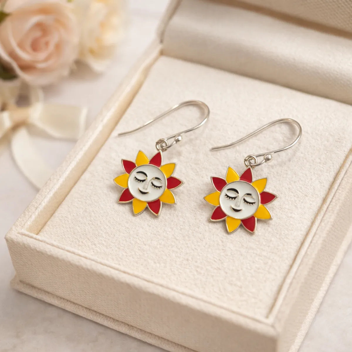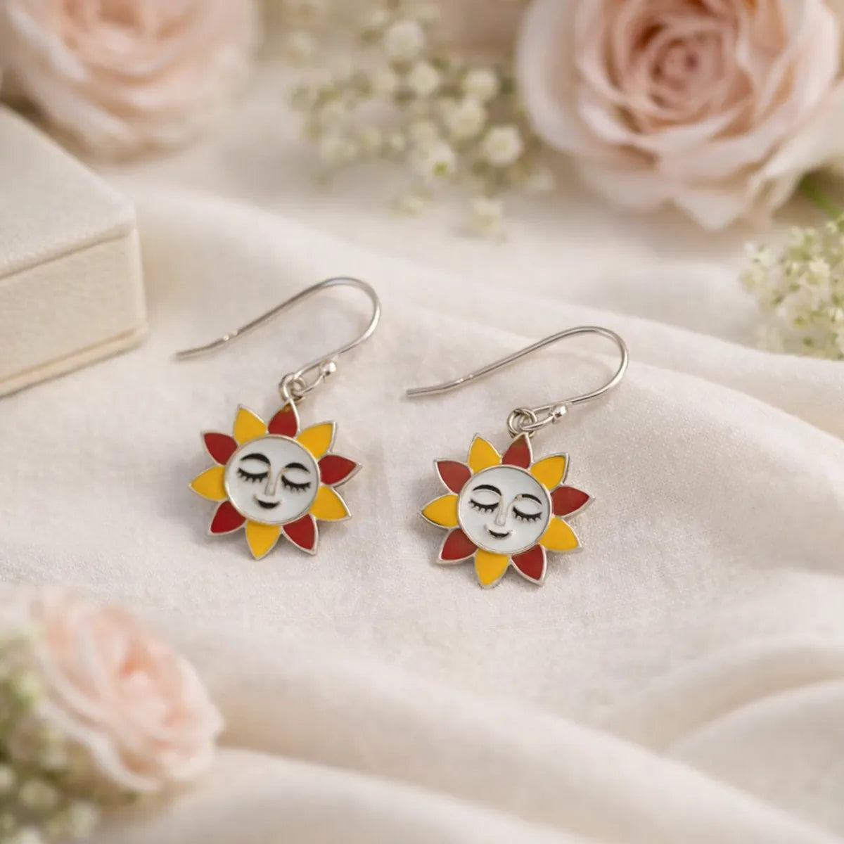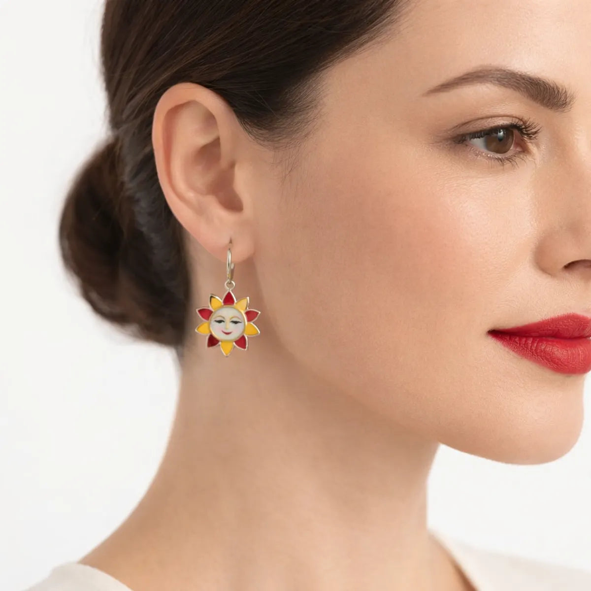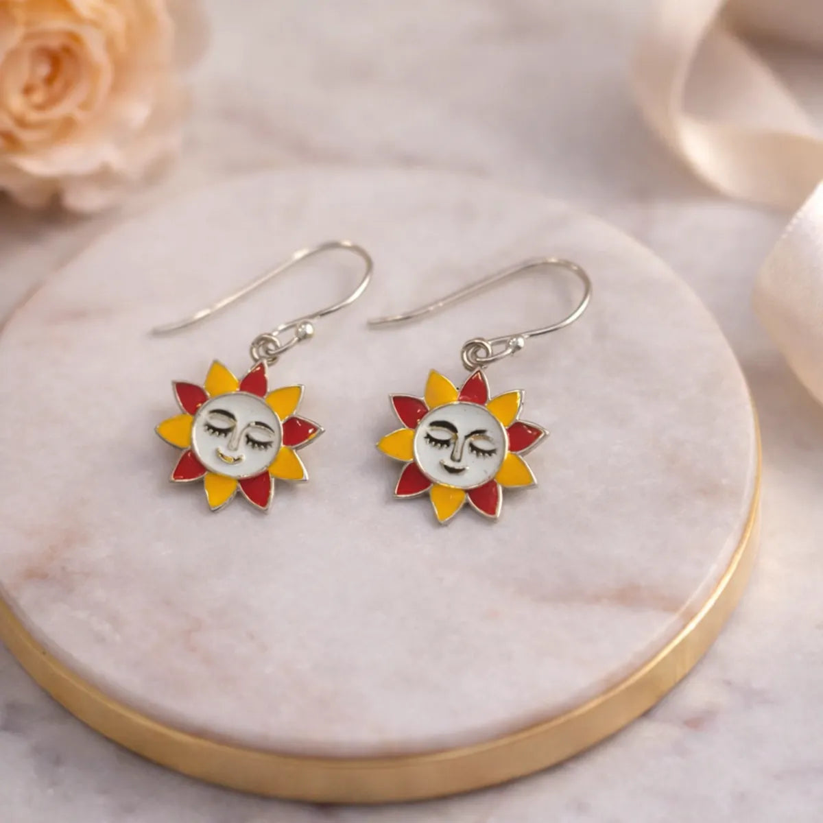 Sun Face Meenakari Silver Dangle Earrings Folk Art Enamel Women